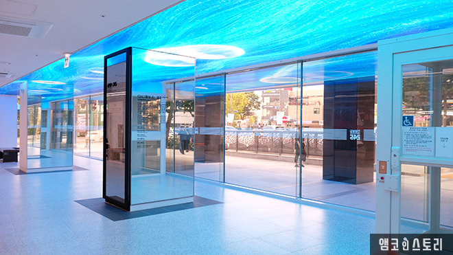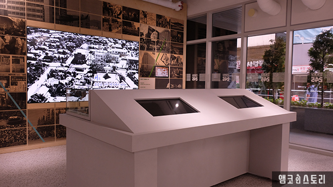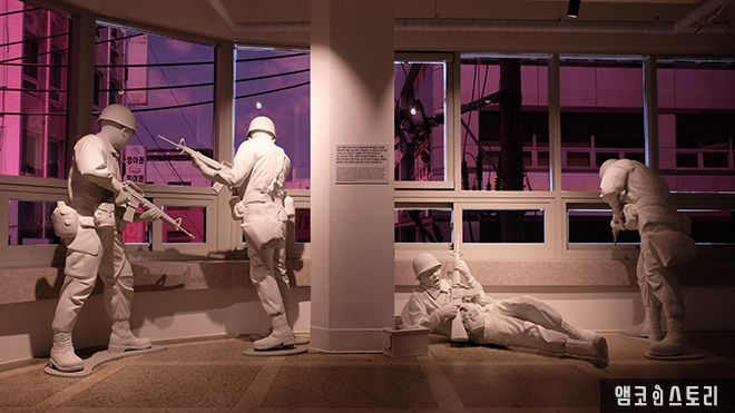 리모델링으로 다시 태어난 전일빌딩245는 외부는 그 전과 99% 동일한 모습을 하고 있지만 내부는 그전과 같은 사무실 용도가 아닌 시민문화시설로 사용되고 있습니다. 코로나19 방역을 마치고 들어선 내부, 1층 로비에는 <전일 아카이브>라는 타이틀 아래 전일빌딩의 역사를 한눈에 살펴볼 수 있는 전시공간이 마련되어 있는데요, 5.18민주화운동 당시의 현장을 생생하게 느낄 수 있는 사진과 모형 등이 인상적으로 그 외, 건물 안팎의 천장으로 펼쳐지는 미디어 아트 역시 화려한 볼거리로 방문객을 반갑게 맞이하고 있습니다.