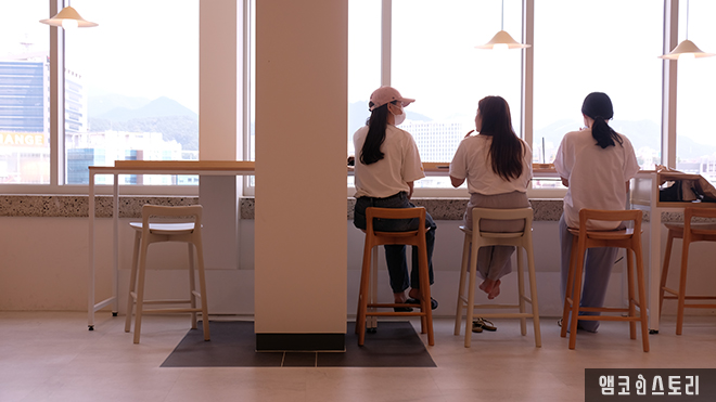 광주콘텐츠허브 공간으로 광주지역 문화 콘텐츠 기업이 입주해 있는 5층~7층은 일반인의 출입이 금지되어 있습니다. 하여 곧장 8층을 향하는 발걸음입니다. 이곳은 이전 전일 방송이 있던 자리로 현재 ‘카페245’와 ‘VOC라운지’ 등 휴식공간으로 조성 및 운영되고 있습니다. 차를 마시며 자유롭게 담소를 나누는 시민들, 통창으로 내려다보는 풍경으로 옛 전남도청 부지에 자리한 아시아문화전당(ACC)이 위풍당당합니다.