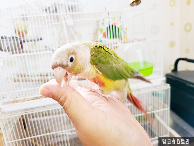 이름은 사랑이, 행복이, 마음이, 소심이랍니다. 네 마리 모두 성격도 틀리고 자세히 보면 생김새도 약간씩 달라요. 처음 보면 다 똑같이 생겼다 생각되지만요. 남들에게는 낯설지만 제게는 익숙한 앵무새 네 마리와 같이 생활하고 있습니다. 어려서부터 이유식을 직접 주고 키워서 그런지 부모로 인식해 저를 많이 따르며 놀아달라고 많이 졸라요. 네 마리를 키우다 보니 많이 시끄럽고 정신없지만 귀여움으로 다 용서가 됩니다. 보통 앵무새의 수명이 20년 정도라 이제 세 살이니 앞으로 17년을 같이 살 수 있겠네요. 오래오래 함께 살았으면 좋겠습니다. 여러분도 앵무새의 매력에 빠져들 보시지요! 🐦