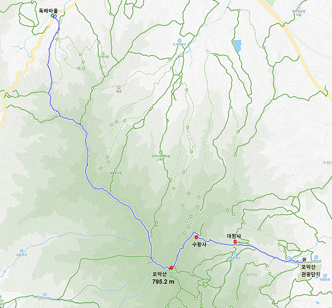 독배마을에서 모악산 정상까지는 완만하게 능선이 이어져 오르는 길이 둘레길 같이 평탄하고 어렵지 않으며, 사람이 많이 다니지 않아 여유롭게 오르기 좋습니다. 능선을 넘어가며 정상을 바라보며 걷다 보면 날이 밝아오며 어우러지는 경치가 좋았습니다.