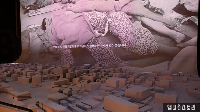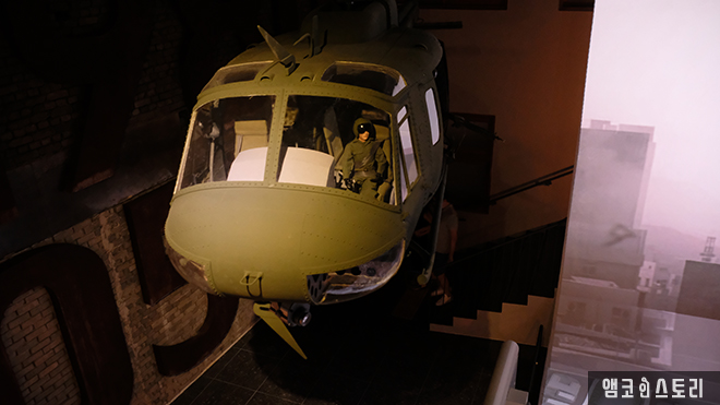 10층에 들어서면 245개 탄흔을 영상화할 작품 <검은 하늘 그날>과 <민주의 탄생환>을 만나게 됩니다. 다양한 증언을 토대로 꾸며진 헬기 사격 멀티영상은 기총소사에 의해 사격을 당한 전일빌딩의 그 날을 각색하여 애니메이션으로 보여주고 있는데요, 화면 아래 금남로 일대를 축소 제작한 도시 모형에 빛이 비치면 ‘두두두두’ 소리와 함께 공중에 매달린 모형헬기에서는 총알이 빗발치는 등 실감 나는 콘텐츠를 재생하고 있습니다.