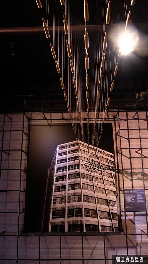10층에 들어서면 245개 탄흔을 영상화할 작품 <검은 하늘 그날>과 <민주의 탄생환>을 만나게 됩니다. 다양한 증언을 토대로 꾸며진 헬기 사격 멀티영상은 기총소사에 의해 사격을 당한 전일빌딩의 그 날을 각색하여 애니메이션으로 보여주고 있는데요, 화면 아래 금남로 일대를 축소 제작한 도시 모형에 빛이 비치면 ‘두두두두’ 소리와 함께 공중에 매달린 모형헬기에서는 총알이 빗발치는 등 실감 나는 콘텐츠를 재생하고 있습니다.