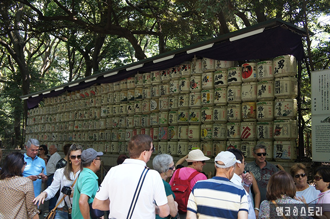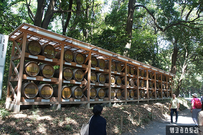 아니, 이것은 무엇인가. 엄청나게 많은 사케 통들이 마치 벽처럼 쌓여 있다. 이것은 메이지 신궁의 전국사케연합에서 매년 사케를 진상하며 메이지 황제와 쇼켄 황후의 넋을 기리는 것이라 한다.