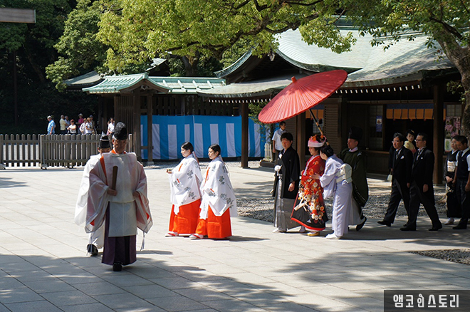 우리가 갔을 때 마침 일본 전통 혼례식이 진행되고 있었다. 한국의 전통 혼례와는 참 달라 보인다.