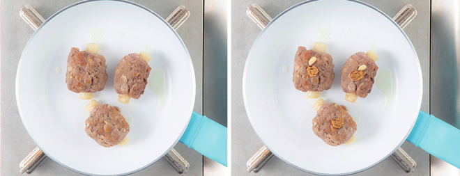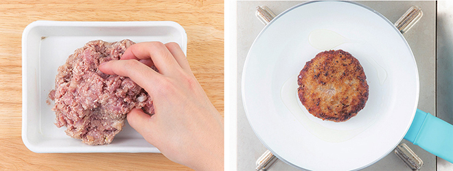 ④ 점성이 생긴 고기를 동그랗게 성형한 후 팬에 굽는다.