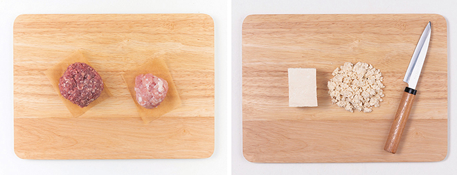 ① 분쇄 우육과 돈육은 해동 후 핏물을 제거한다.
