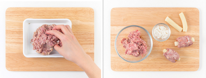 ④ 데쳐서 익힌 떡에 밀가루를 얇게 입히고 ③의 반죽을 붙여 떡갈비를 만든다.