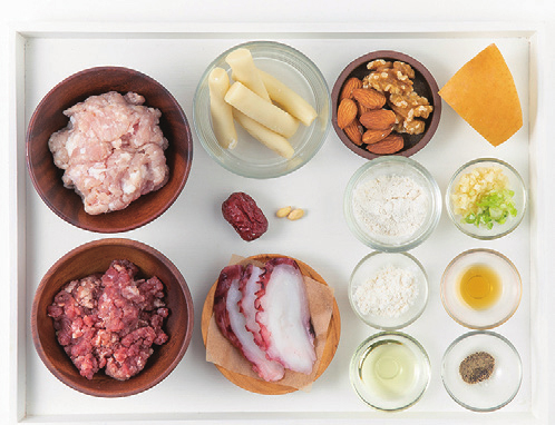 돈민찌 80g, 우민찌 30g, 떡 40g, 문어 3g, 배 5g, 호두 3g, 아몬드 3g, 다진 마늘 5g, 다진파 5g, 찹쌀가루 5g, 참기름 1g, 후추 1g, 밀가루 0.5g, 식용유 5g, 대추 2g, 잣 2g