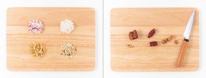 ① 삶은 문어, 배, 호두, 아몬드는 작게 자르고, 파와 마늘은 다진다.