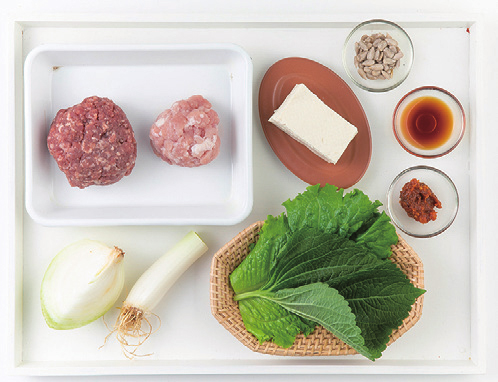 우육(분쇄육) 60g, 돈육(분쇄육) 30g, 두부 30g, 양파 5g, 대파 5g, 상추 30g, 깻잎 10g, 해바라기 씨 2g, 간장 0.5g, 설탕 5g, 쌈장 5g
