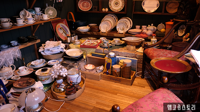 <지음책방>에는 책뿐만 아니라 책방지기 부부가 여행하며 모은 부엉이 소품, 빈티지 그릇 등이 책방 공간 곳곳에 배치되어 있습니다. 조명, 냅킨꽂이, 라디오, 전축 등등. 오래된 소품들은 물론, 한쪽에 장식처럼 놓인 자개장 문짝도 색다른 느낌으로 다가오는 공간 연출입니다. 어떤 수집품들은 구매가 가능하다고 하니 마음에 들면 가격을 살짝 물어보는 것도 나쁘지 않아 보입니다. 특히 별도 공간으로 빼곡한 빈티지 찻잔들은 여성 방문객들의 마음을 단번에 사로잡아 공간으로 달그락달그락 그릇 뒤적이는 소리가 끊기지 않네요.