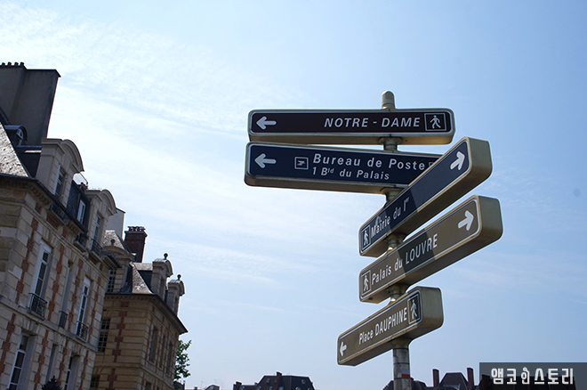 파리에서는 흔하디흔한 도로 표지판이긴 하지만, 처음 여행 온 관광객이 보는 표시판은 멋스럽기까지 하다. 파란 하늘과 잘 어울린다.