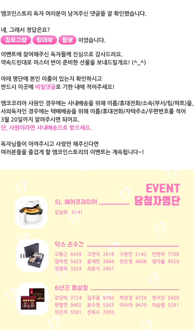 | 웹진 [앰코인스토리] 앰코를 찾아라! 이벤트 결과 발표 (35) | 2021.03.24 |