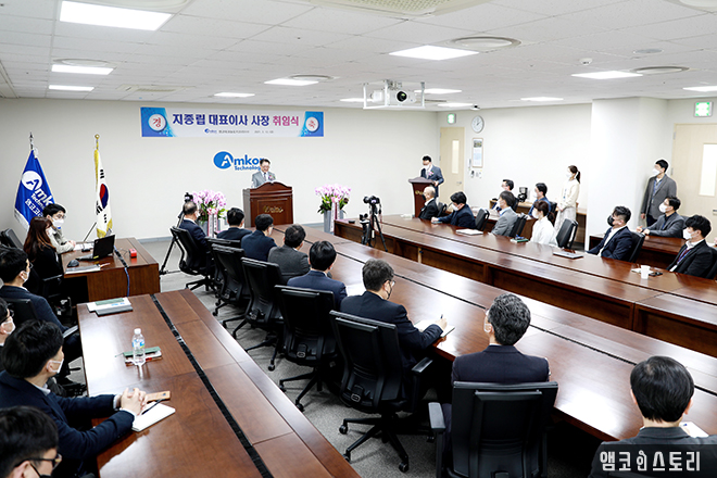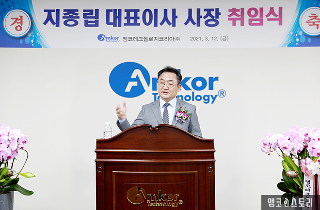 2021년 3월 12일 금요일, 앰코테크놀로지코리아㈜ 대표이사에 취임한 지종립 사장이 K5사업장에서 전 임원과 관리자들이 참석한 가운데 취임식을 가졌습니다.