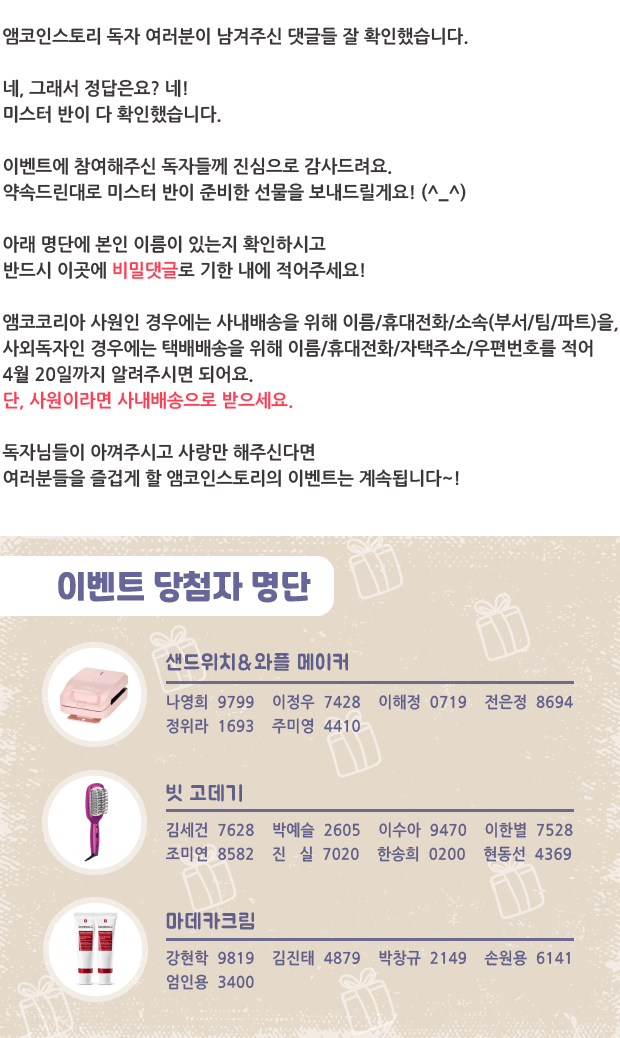 | 웹진 [앰코인스토리] 깜짝 땡땡 퀴즈 이벤트 결과 발표 (24) | 2021.03.02 |