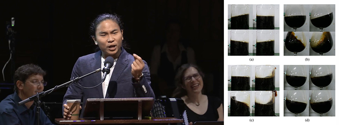 비교적 최근에 또다시 이그노벨상을 수상한 한국인이 있습니다. 2017 이그노벨상 유체역학상을 받은 한지원 씨인데요, 그의 주제 역시 흥미롭습니다. 우리가 커피를 들고 걸을 때 찰랑대던 커피가 컵 밖으로 넘쳐 나와 옷과 가방을 버리게 할 때가 종종 있지요. 리드로 덮여 있어도 구멍 위로 튀어 올라오는 커피를 완벽히 막을 수는 없어요. 와인잔을 들고 걸어보면 어떨까요? 와인은 커피만큼 튀어 오르거나 밖으로 넘치질 않습니다. 과연 왜 그럴까, 이것이 한지원 씨의 궁금증이었지요.