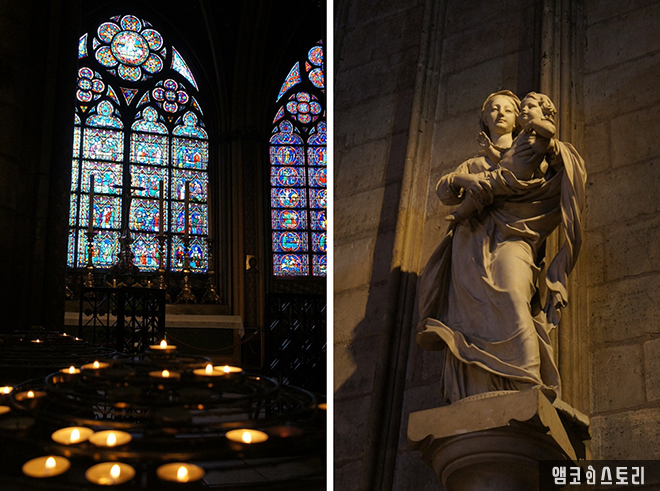 여기저기 기도를 위한 촛불이 켜져 있고, 각각 다른 스테인드글라스 창문을 통해 햇빛이 쏟아져 들어오고 있었다.
