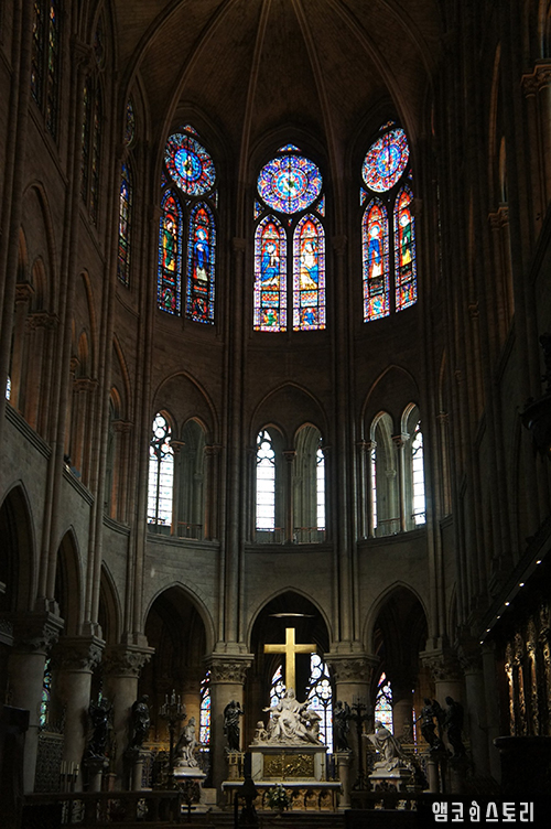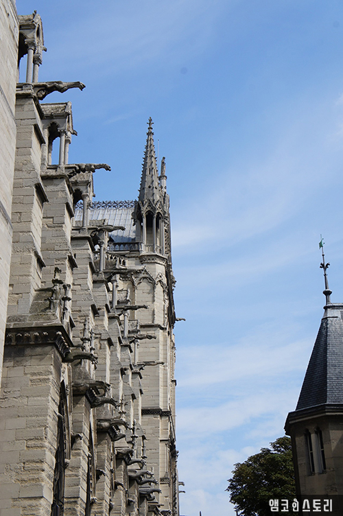 성당 꼭대기에서 노트르담의 곱추가 금방이라도 튀어나와 종을 칠 것만 같이 시간을 잊은 듯한 모습이다. 단연 세월을 잊고 우뚝 서 있는 세계 최고의 고딕 건축물 중 하나다. 넋을 잃고 바라보면서 노트르담 대성당 입구로 들어간다.