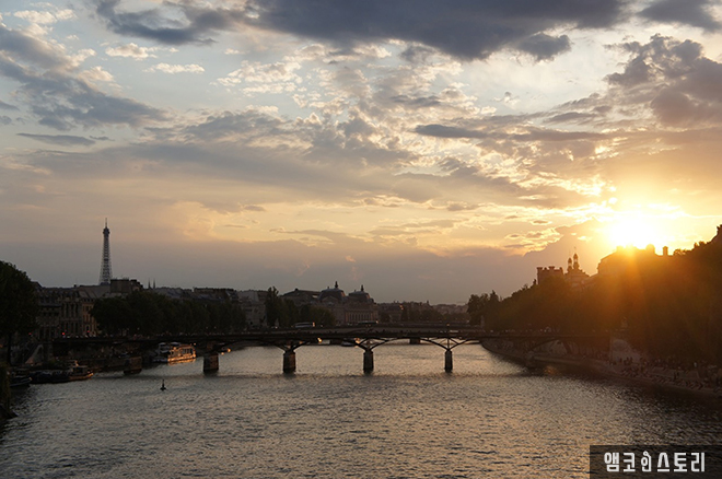 어느새 유람선 탑승 시간이 다가온다. 숙소에서 슬슬 걸어 나와 퐁네프 다리를 다시 건너는데 아름다운 센강 위로 어둠이 내리고 있다. 저 멀리 에펠탑도 보인다.