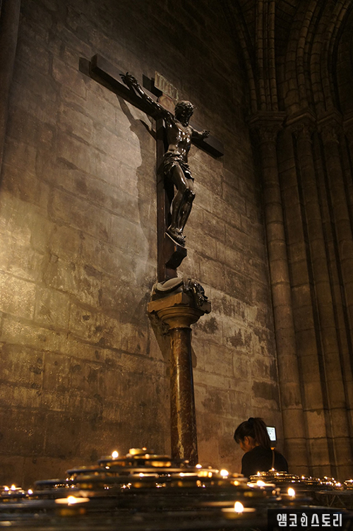 정교하게 조각된 성모 마리아와 아기 예수상도 보이고, 십자가에 못 박힌 예수님상 아래에 두 손 모아 간절히 기도하는 어느 여성의 뒷모습도 보인다. 부디 소원이 이루어졌기를.