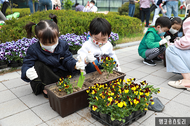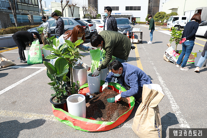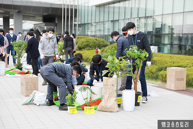 이날 전 사업장의 사원 대표들은 뱅갈 고무나무, 녹보수, 해피트리 등의 실내 공기 개선에 효과가 있는 나무를 부서 내 비치할 수 있도록 작업하였습니다. 전 사업장의 앰코어린이집 원아들도 함께하여 작은 고사리손으로 팬지 등의 초화 심는 것을 돕기도 했습니다.