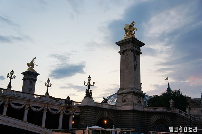 다리의 예쁜 아치와 은은한 조명, 그 조명을 받아 황금빛으로 출렁이는 센강 풍경이 장관이다.
