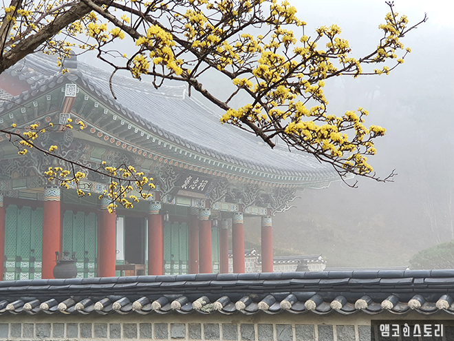 봄을 알리는 전령사가 매화, 목련화, 벚꽃, 개나리라면, 안개 자욱한 사찰 속에서 도도히 꽃을 피운 산수유꽃은 봄의 여신이라고 할까.