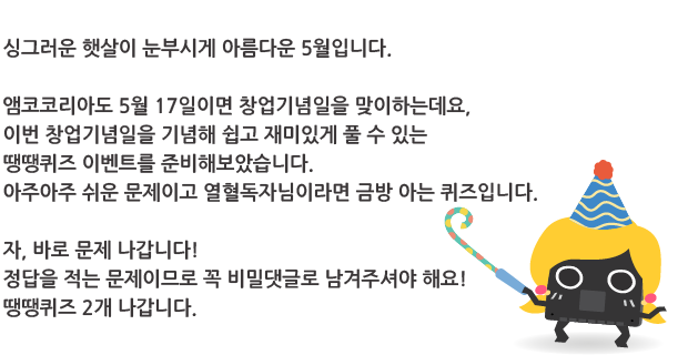 | 웹진 [앰코인스토리] 앰코코리아 53주년 기념 땡땡퀴즈 이벤트 결과 발표 (32) | 2021.05.24 |