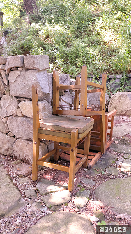 ㄱ자 벽 전체가 투명한 유리로 마감되어 외경이 그대로 보이는 카페는 사방이 산으로 둘러싸여 있다 보니 그야말로 환상적인 전망이 펼쳐집니다. 어느새 봄맞이 새 옷을 갈아입은 산, 파릇파릇 연둣빛 물결이 새롭게 시작하는 사계의 순리를 떠올리게 합니다. 카페 입구와 내부의 빈티지 가구와 소품 또한 같은 시선에서 의미를 갖는 수만리 커피, 마당 공간에도 군데군데 커피를 즐길 수 있는 자리가 다양하게 마련되어 있습니다. 수만리 커피의 일부 공간은 자연 발생적인지 아니면 부러 인공적으로 꾸민 것인지 모르겠지만 옛 성터의 흔적과 같은 돌담을 만날 수 있습니다. 큰 나무 아래 커다란 바위에 아무렇게 걸터앉아 홀짝이는 커피 또한 색다른 맛과 멋을 느끼게 하는 공간입니다.