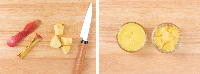 ⑤ 믹서기에 사과, 파인애플, 레몬즙을 넣어 곱게 간다.