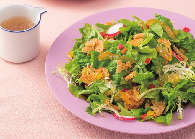 누룽지상추샐러드 & 유자드레싱은 로메인 상추와 파프리카 위에 튀긴 누룽지를 고명처럼 얹고, 유자청, 레몬즙, 올리브유 등으로 만든 소스를 뿌려 먹는 샐러드입니다.
