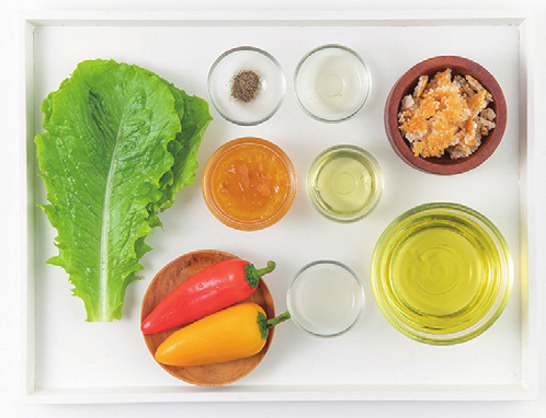 누룽지 5g, 로메인상추 7.5g, 파프리카 12.5g(빨간색/노란색), 유자청 7.5g, 식용유 500g, 올리브유 3.5g, 레몬즙 1g, 식초 1g, 후추 0.1g