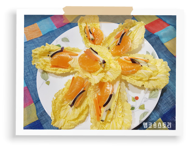 ③ 배추 위에 한라봉과 채소를 차곡차곡 올린다.