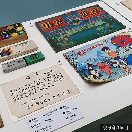 3층의 기획전시관에서는 ‘배움의 역사, 추억의 채움’이라는 특별전시가 진행 중입니다. 이곳에서는 대한민국 교육의 역사를 총망라해 보여주고 있는데요, 철수와 영희가 등장하는 추억의 교과서는 그 시절 국민학교 감성을 자극하며 검정 교복과 얼룩무늬 교련복은 할머니 할아버지의 청춘을 소환합니다. 가을 운동회도 떠오릅니다. 청팀과 백팀으로 나눠 콩주머니를 힘껏 던지던 그 시절 열정, 마련된 단상은 포토존으로 관람객들은 저마다 재미있는 사진을 남기느라 바쁩니다. 소풍 가방, 스케이트, 썰매 등의 소품을 지나 마지막으로 옛 국민학교 교실을 재현해 놓은 공간에서 아이들은 신기함이 두리번거리고 부모님은 추억에 담겨 과거를 회상하고 있네요.