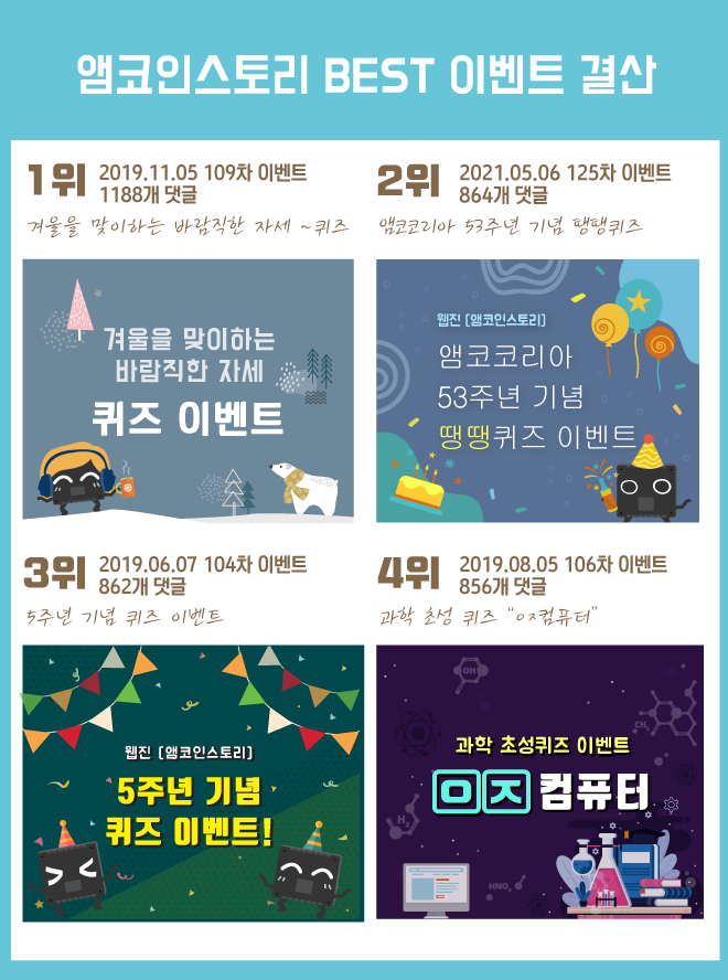 | 웹진 [앰코인스토리] 앰코코리아 53주년 기념 땡땡퀴즈 이벤트 결과 발표 (32) | 2021.05.24 |
