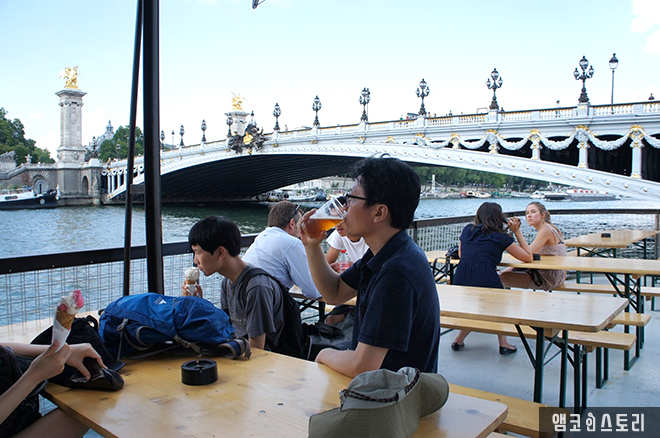알렉상드르 3세 다리 밑으로 내려가 센강 변에 있는 어느 레스토랑에서 아이들은 아이스크림을 먹고, 필자는 시원한 생맥주 한 잔을 마신다.