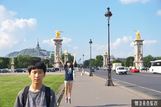 알렉상드르 3세 다리 밑으로 내려가 센강 변에 있는 어느 레스토랑에서 아이들은 아이스크림을 먹고, 필자는 시원한 생맥주 한 잔을 마신다.