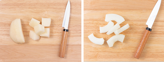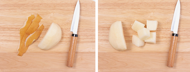 ② 껍질 벗긴 배를 깍뚝썰기 한다.
