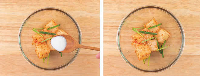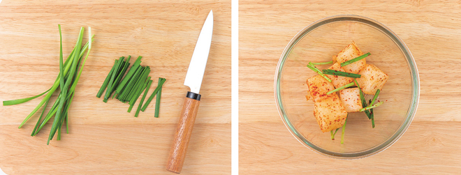 ④ 배와 부추에 고춧가루를 버무려 색이 배도록 한다.