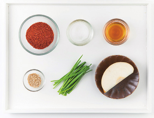 배 80g, 부추 5g, 고춧가루 5g, 매실청 3g, 설탕 2g, 참깨 1g