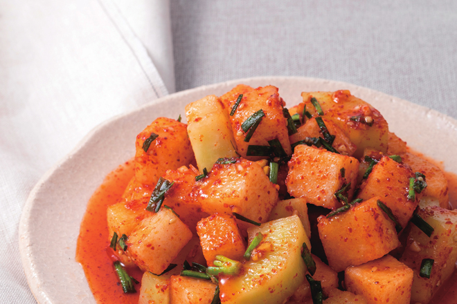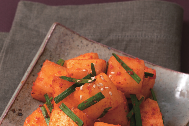 깍두기란 무를 ‘팔모썰기’하여 소금에 절인 후, 고춧가루를 버무리고 파, 마늘, 생강, 새우젓 등의 양념을 넣고 담근 것을 말합니다. 「조선요리학」을 보면 200년 전에 정종의 사위인 영명위 홍현주 부인이 임금에게 처음으로 깍두기를 담가 올려 칭찬을 받았다고 나옵니다. 당시에는 각독기(刻毒氣)라 불렀으며, 그 후 여염집에도 퍼졌습니다.