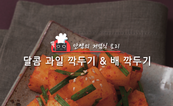 달콤 과일 깍두기와 배 깍두기의 저염식 요리 방법을 보면, 달콤 과일 깍두기는 소금에 절이지 않아 나트륨 섭취를 줄였고, 배 깍두기는 배를 소금에 절이지 않고 고춧가루와 매실청으로 버무렸습니다.