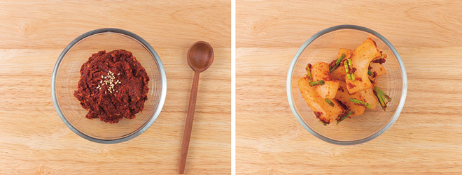 ⑤ 고춧가루, 새우젓, 마늘, 생강, 통깨를 버무려 양념장을 만든다.
