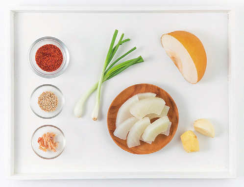 배 16.63g, 참외 8.83g, 고춧가루 0.57g, 깐마늘 0.6g, 새우젓 0.2g, 깐생강 0.24g, 깐실파 0.6g, 통깨 0.14g
