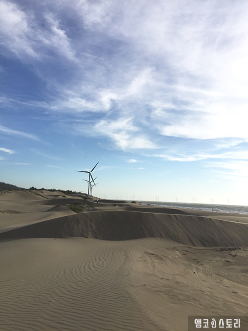 모래언덕은 바람에 의해 모래가 이동해 쌓이고, 그 쌓인 모래가 언덕이나 둑 모양을 이룹니다. 대만은 바람이 많이 부는데, 바닷가는 유독 바람이 더 세게 부는 것 같아요. 그래서 이런 바람으로 형성된 모래언덕을 바닷가에서 종종 볼 수 있습니다.