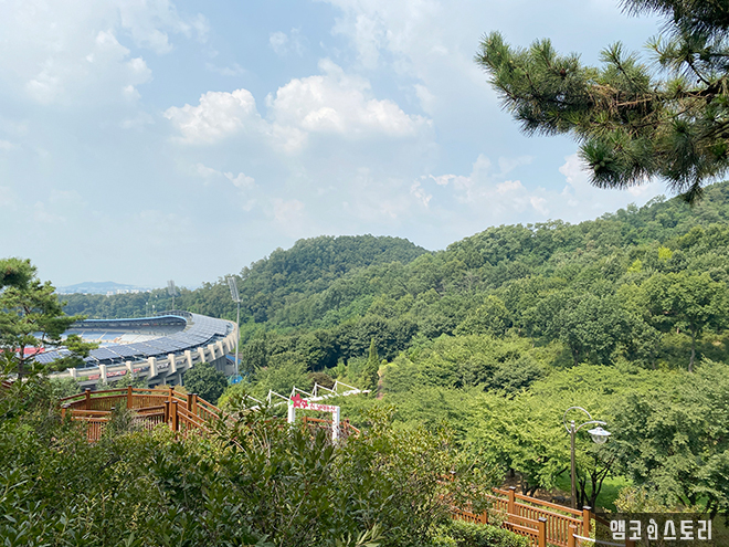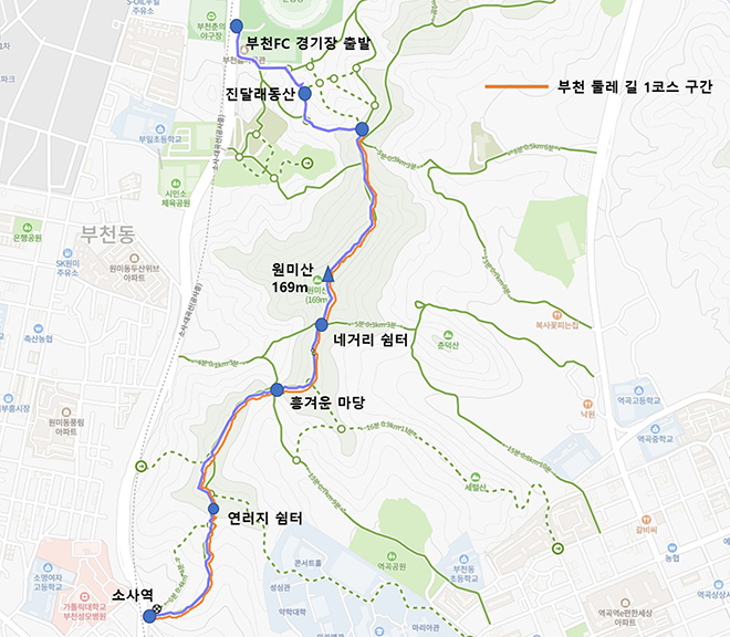 부천둘레길 1코스가 겹쳐지는 원미산은 프로축구단 부천 FC경기장에서 출발하여 소사역까지의 길로 울창한 나무로 덮여 있어 여름에도 덥지 않고 최고 169m로 높지 않아, 노약자와 남녀노소 누구나 친근하게 산책처럼 다녀오기 좋은 곳입니다. 멀리서 원미산을 바라봤을 때 눈에 띄지는 않지만, 그 안에 조성된 둘레길과 주민편의시설들은 너무 잘 되어 있었습니다.