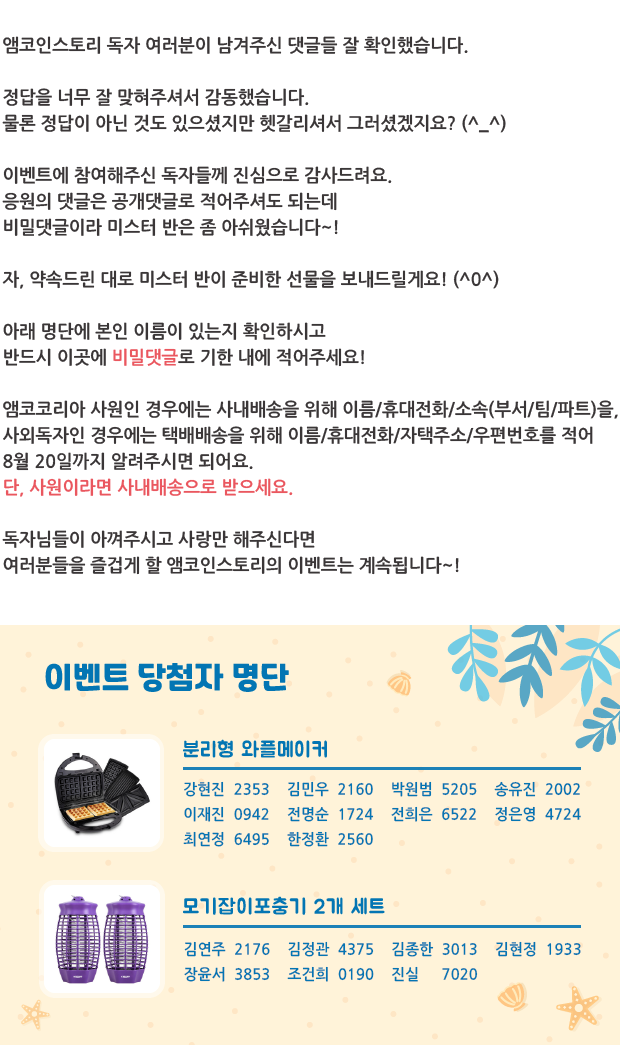 | 웹진 [앰코인스토리] 미스터 반과 함께 시원한 바다로~! 숨은그림찾기 이벤트 결과 발표 (38) | 2021.08.25 |