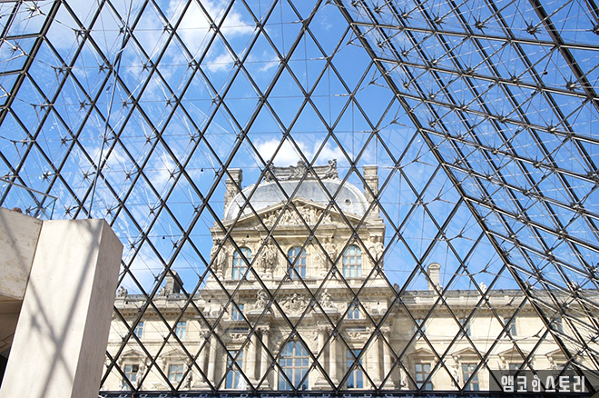 루브르의 상징처럼 되어버린 피라미드형 조형물 앞에서 발걸음을 멈추고 사진을 남긴다.