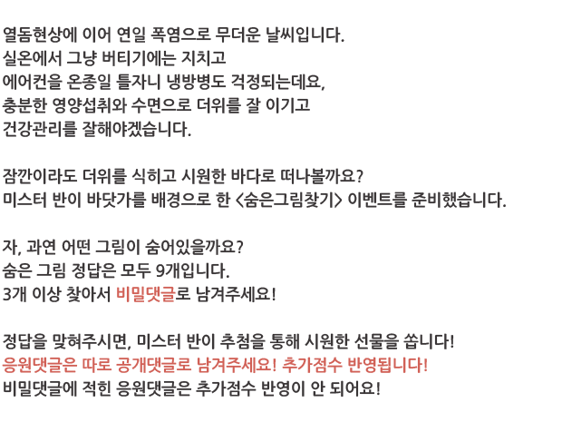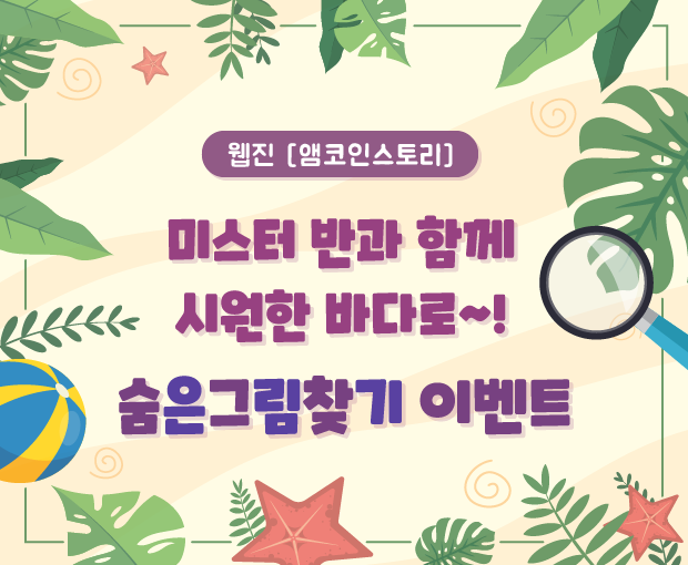 | 웹진 [앰코인스토리] 미스터 반과 함께 시원한 바다로~! 숨은그림찾기 이벤트 결과 발표 (38) | 2021.08.25 |