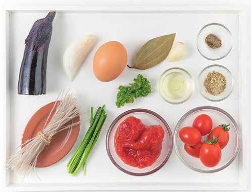 가지 7g, 당면 5g, 계란 75g(1.5개), 부추 5g, 양파 10g, 식용유 3g, 토마토홀 30g, 월계수 잎 1g, 파슬리 1g, 마늘 3g, 함초소금 0.5g, 후추 0.5g